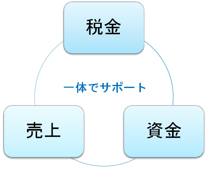 企業の経営に必要な税金、資金、売上を一体でサポートして参ります。